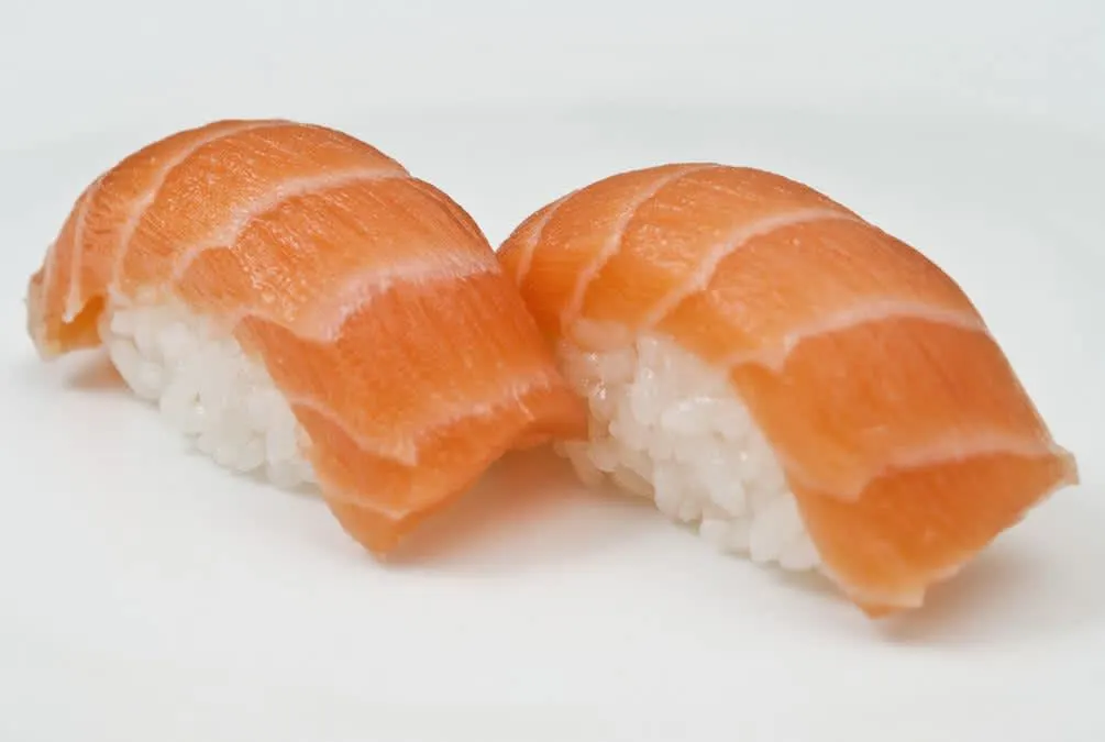 niguiri de salmão maçaricado com geleia de pimenta .