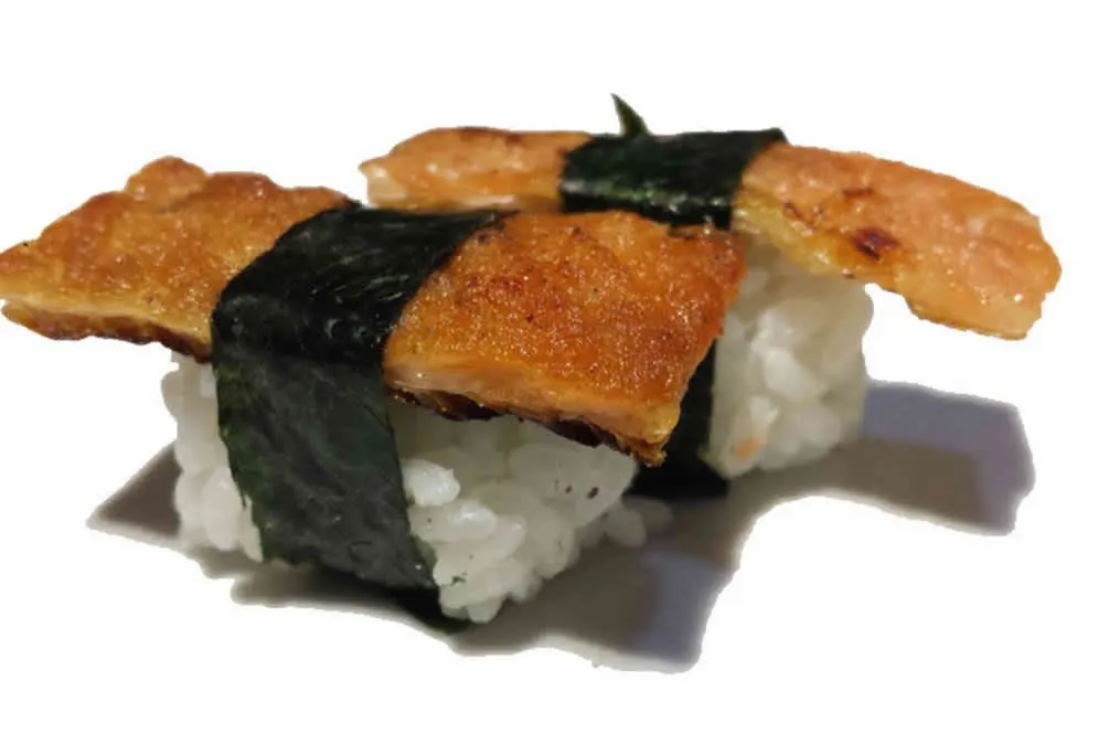 niguiri de salmão maçaricado com geleia de pimenta .