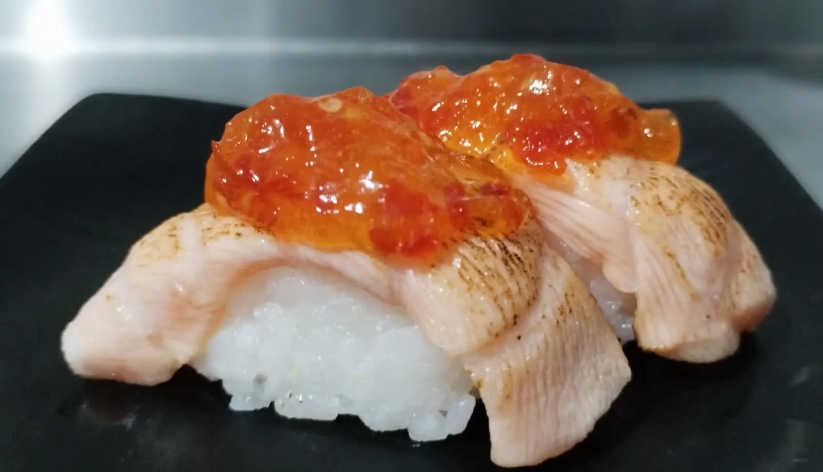 niguiri de salmão maçaricado com geleia de pimenta .