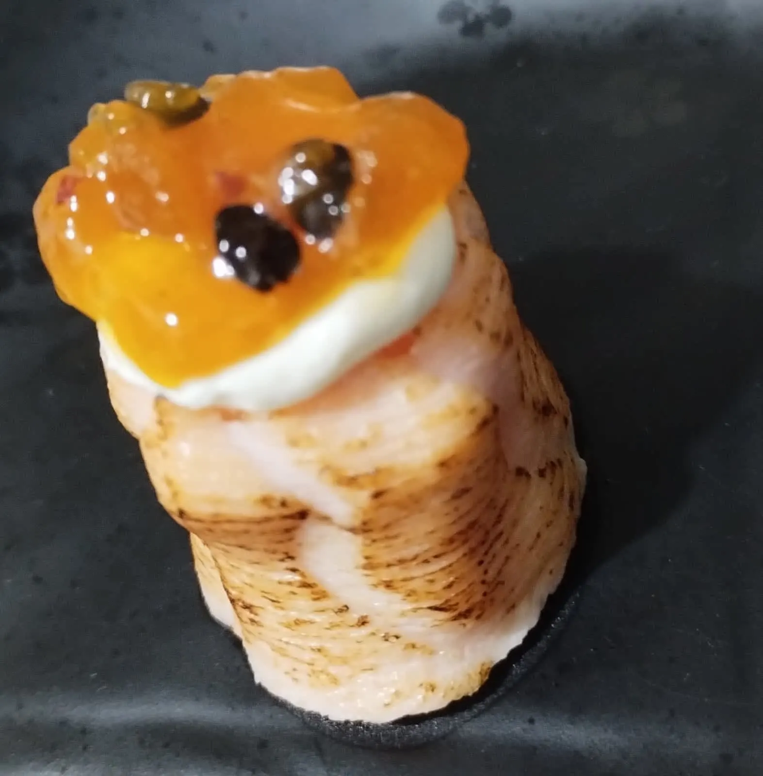 Salmão, Cream chesse ,geleia de Maracujá com pimenta, maçaricado
