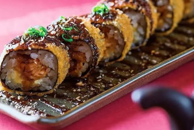 Salmão, Cream Cheese, Empanado em Doritos, Pimenta, Tare e Cebolinha