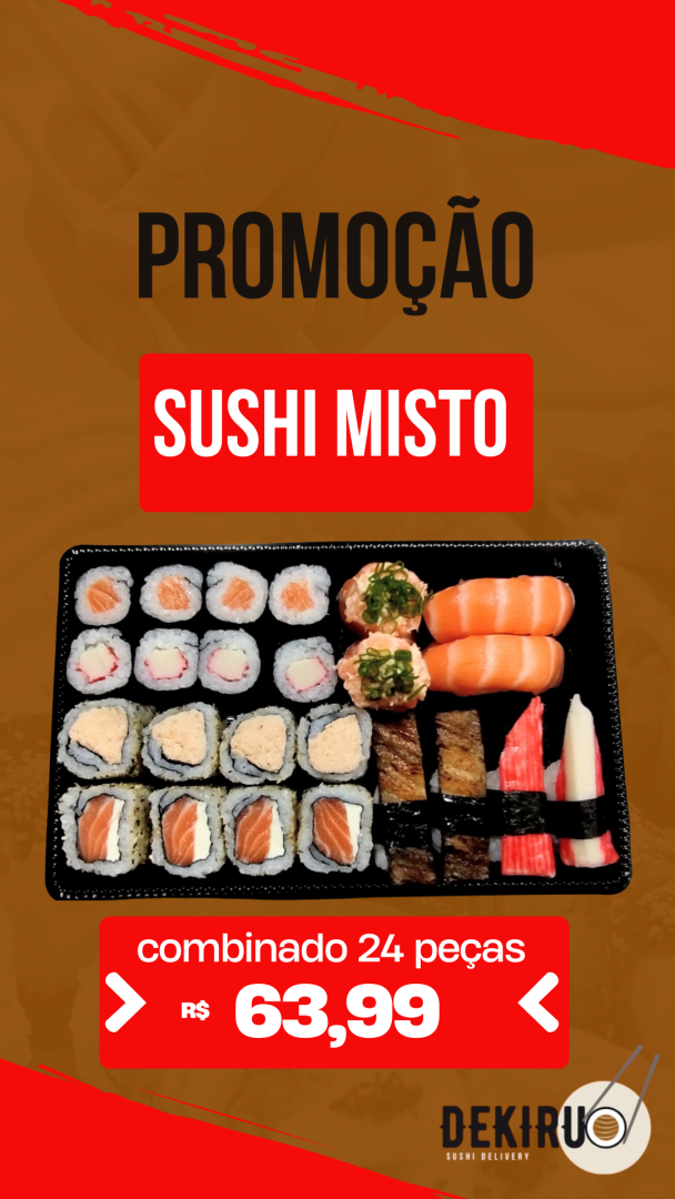 4 uramaki salmão Filadélfia , 4 uramaki kani , 4 uramaki pasta , 4 uramaki skin , 4 hossomaki salmão, 4 hossomaki kani , 4 hossomaki salmão filadelfia, 4 niguiri salmão, , 2 niguiri skin e 2 Joe salmão e 4 hot panko